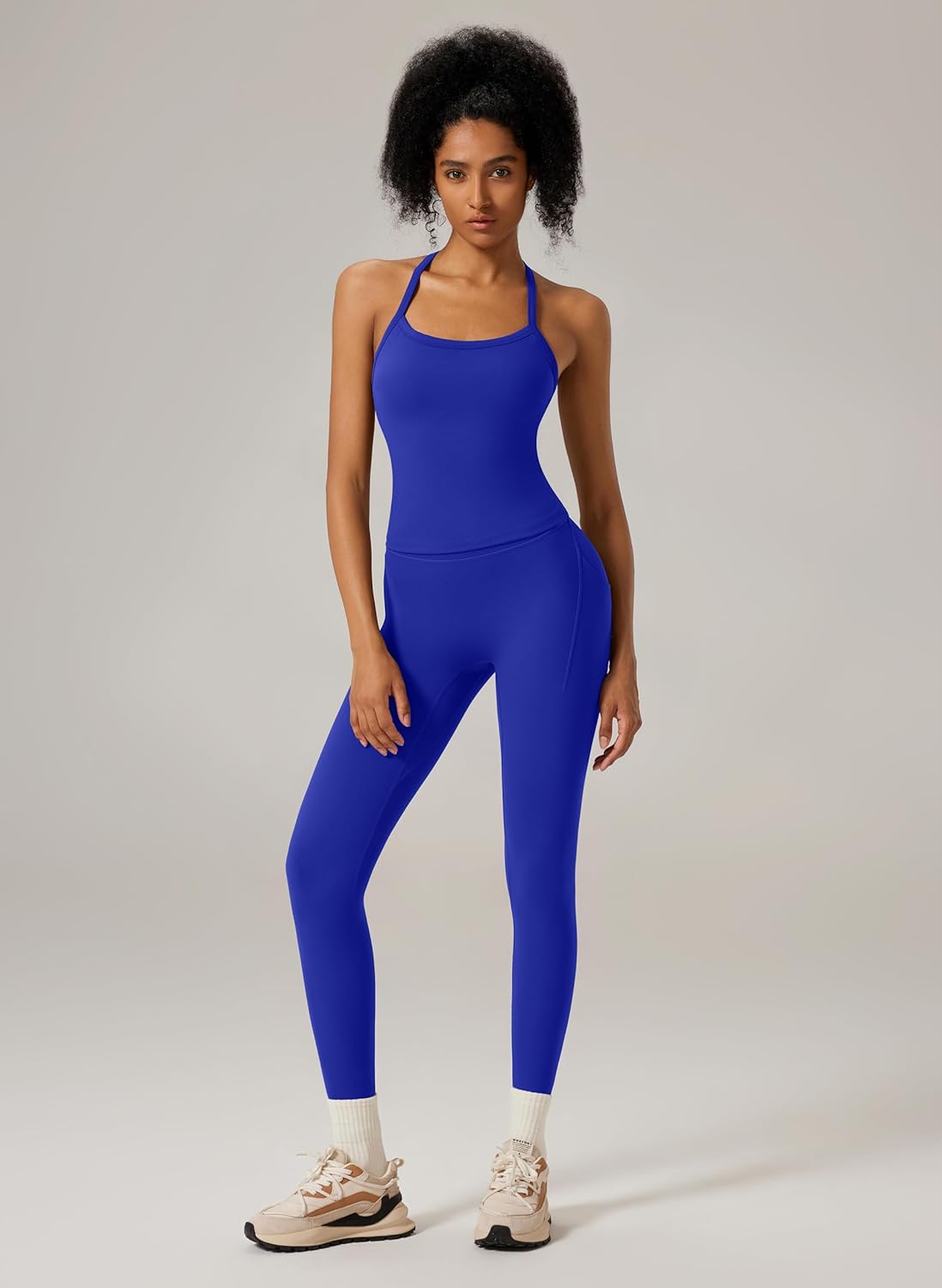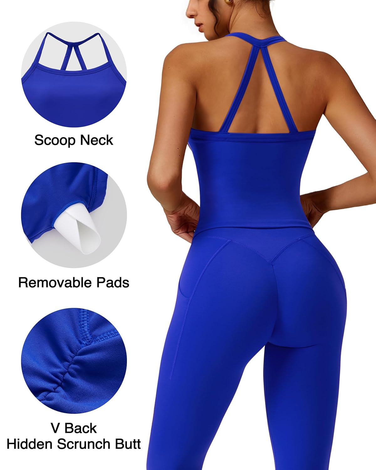 RXRXCOCO Cross Back Workout Sets for Women 2 Piece Padded Tank Tops Hidden Scrunch Leggings Gym Outfits with Pockets